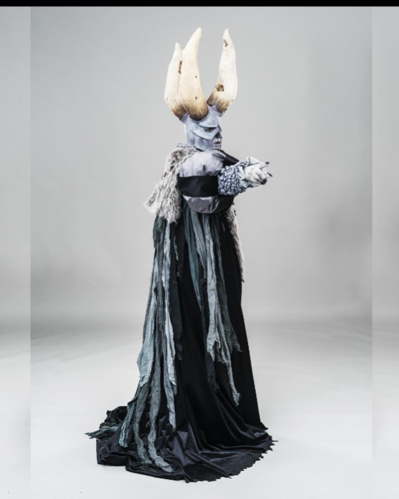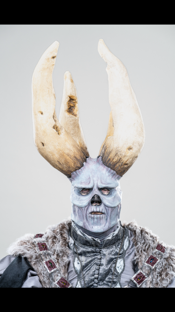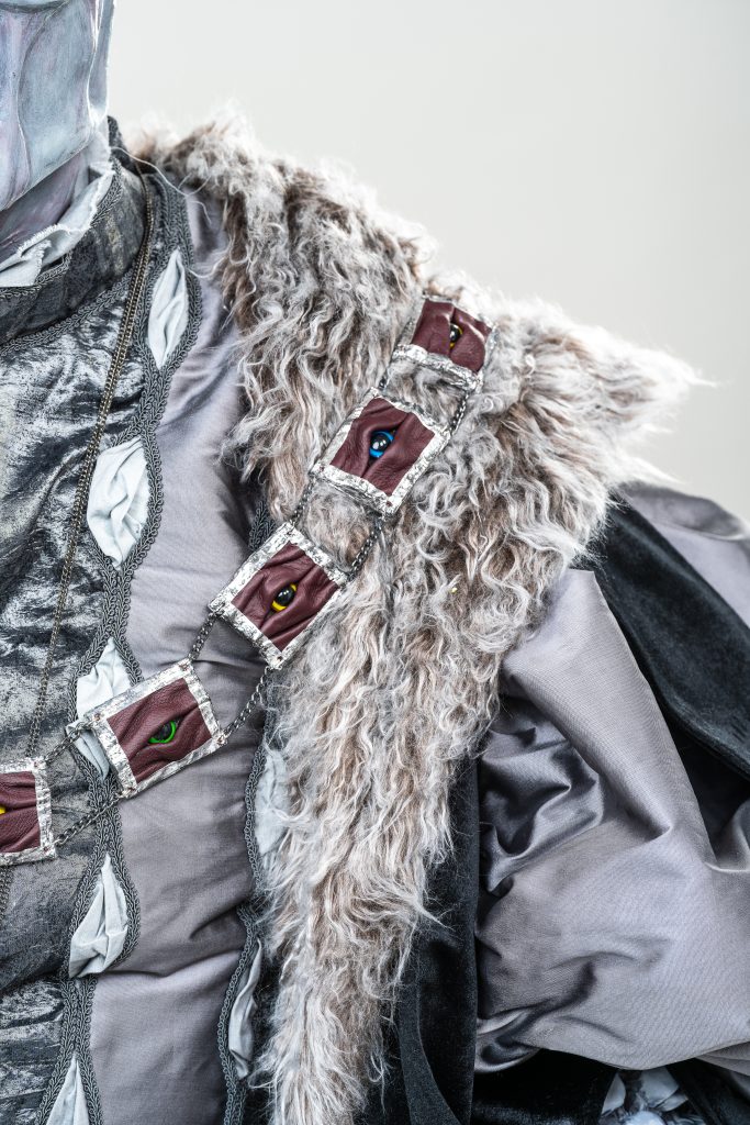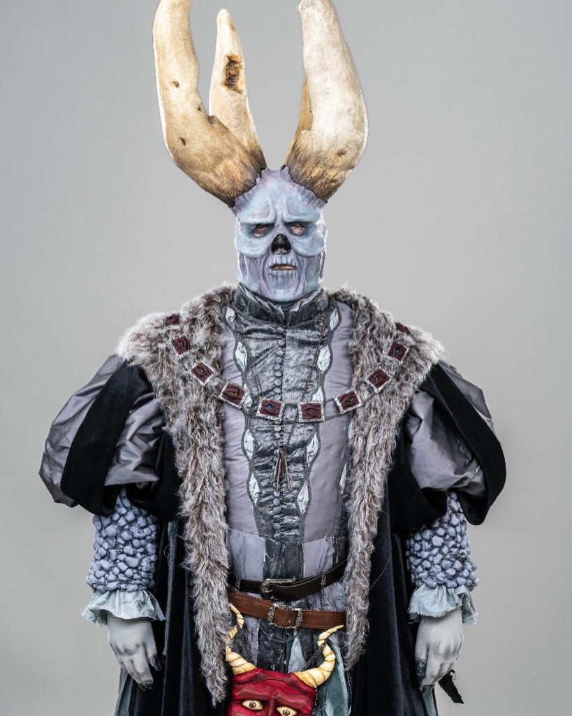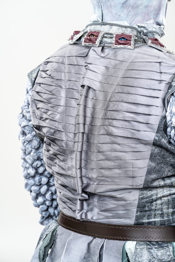 Skills involved include: Historical Patterning, Fabric Manipulation, Leatherwork, Silicone Mask Making, Carving and Painting.