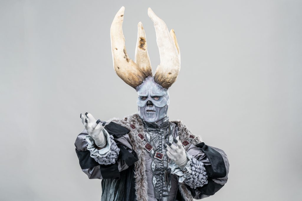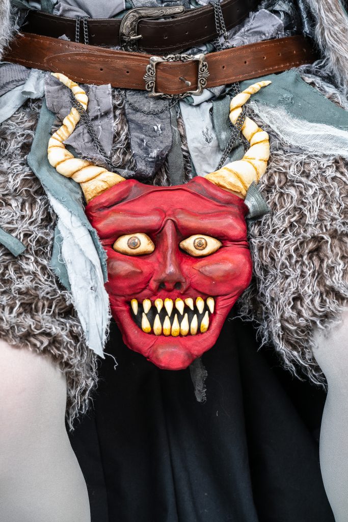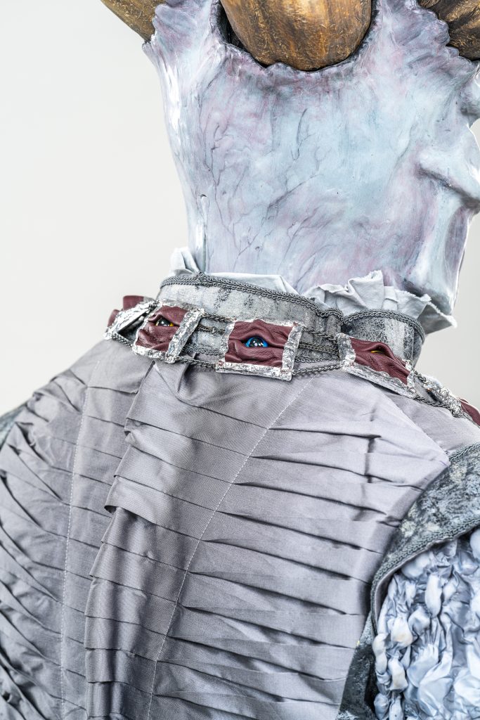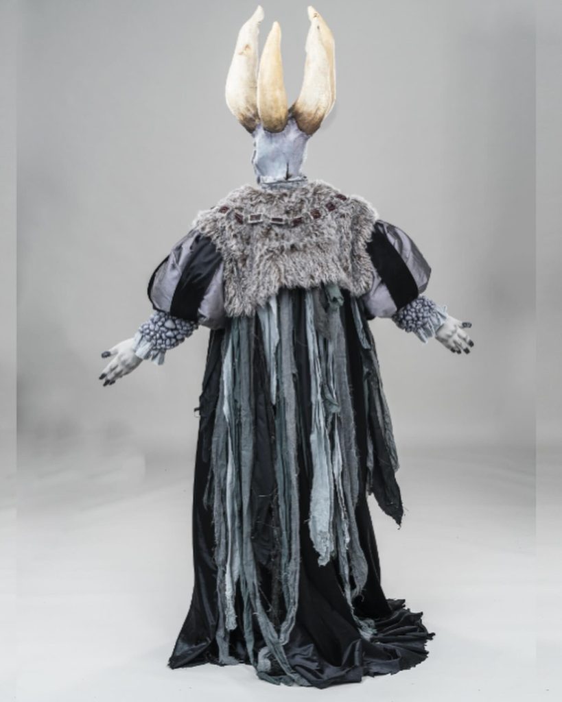 Skills involved include: Historical Patterning, Fabric Manipulation, Leatherwork, Silicone Mask Making, Carving and Painting.